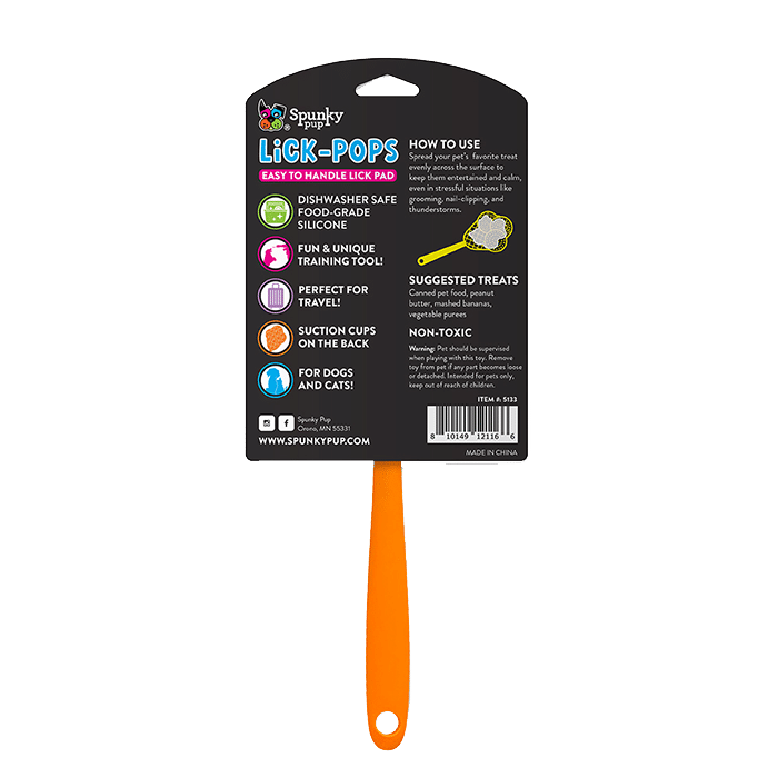 Unleash your pup’s taste buds with our Lick Pops! They are an easy to handle Lick – Pad with a handle for easy feeding. You can spread your pet’s favorite treat evenly across the surface to keep them entertained and/ or calm, even in stressful situations like grooming, nail-clipping and thunderstorms. With suction cups on the back, it provides mental stimulation while keeping your dog relaxed