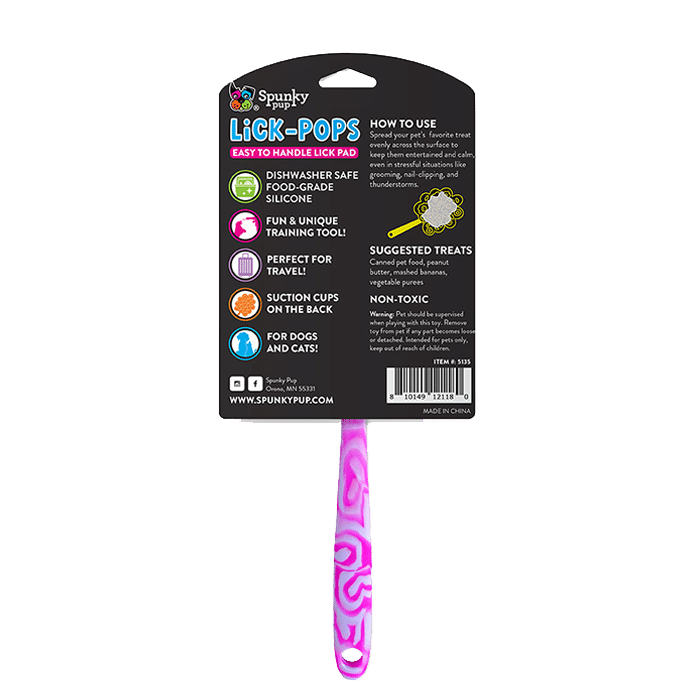 Unleash your pup’s taste buds with our Lick Pops! They are an easy to handle Lick – Pad with a handle for easy feeding. You can spread your pet’s favorite treat evenly across the surface to keep them entertained and/ or calm, even in stressful situations like grooming, nail-clipping and thunderstorms. With suction cups on the back, it provides mental stimulation while keeping your dog relaxed