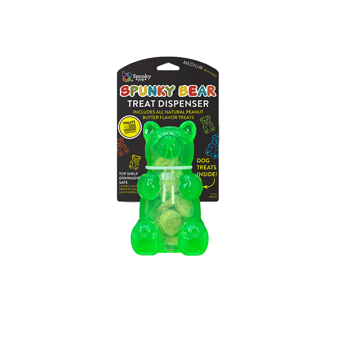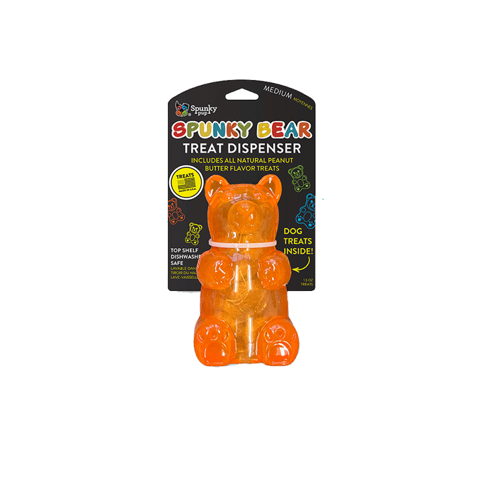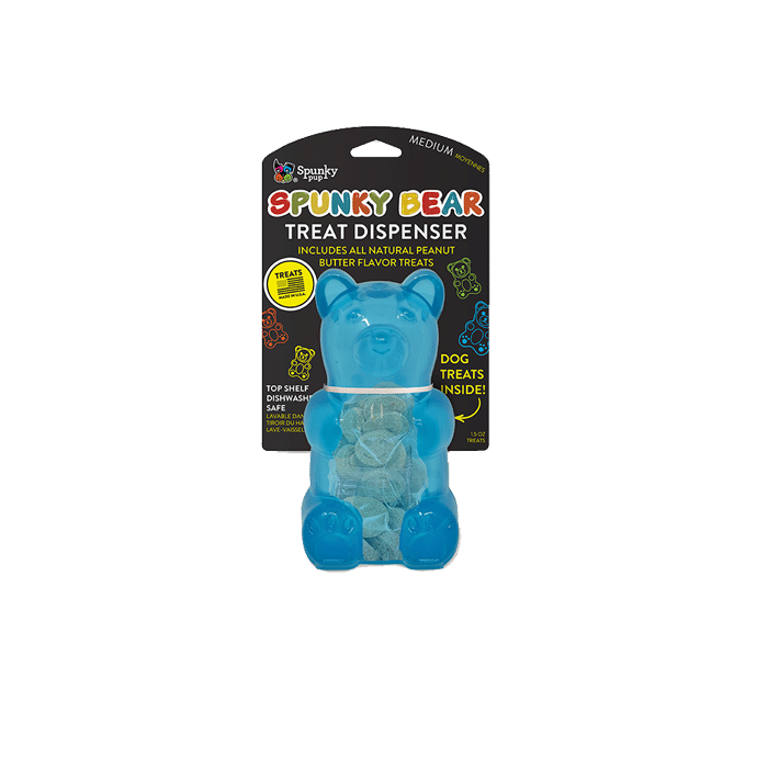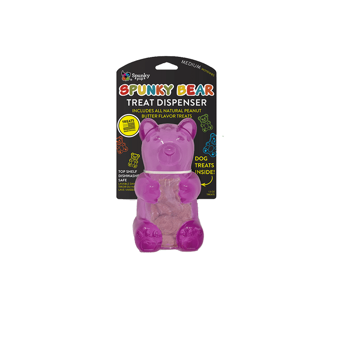 Spunky’s Gummy Bears are the ultimate treat for your furry friend. These rubber gummy bears come in fun, bright colors and are available in multiple sizes. Choose from the treat dispensing Bear, pre-loaded with all natural, baked biscuits, or the squeaky Bear for endless entertainment. Get ready for some pawsome playtime with Spunky’s Gummy Bears!